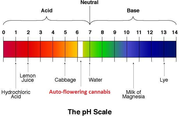 Op een schaal van 1 tot 14 is de neutrale pH waarde 7. Hoe lager de waarde, hoe zuurder de oplossing. Zoals je aan het schema al kunt zien, verschilt de opneembaarheid van de meststoffen tussen de teelt van wiet op aarde en in hydrosystemen. De optimale pH-waarde op aarde ligt wat hoger dan die in een hydrosysteem. Bij aarde ligt die rond de 6,5  terwijl een plant in een hydrosysteem haar voedingsstoffen beter kan opnemen bij een pH waarde van 5,5.