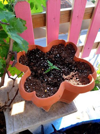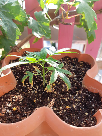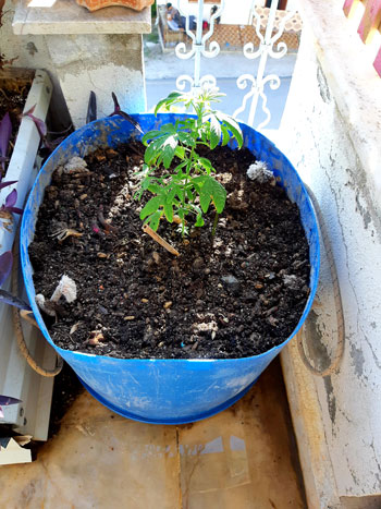 Om toch nog wat extra te kweken heb ik nog wat oude zaadjes van de Bubble Turk van vorig jaar (zie Manifesto’s eerste verslag, red.) de grond in gedaan. Slechts twee kwamen er op, en staan nu in de zon te bakken. Of het dames zijn moet nog blijken, afwachten dus met de vingers gekruist.