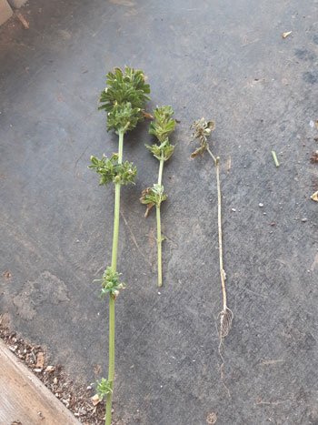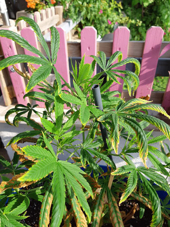 Het resultaat van de meststof is niet geweldig zoals men kan zien op de foto van een gefimde German Hope. Bruine bladeren, verdorde gele randjes, help! De andere dame heeft geen probleem, waardoor ik twijfel of het van de hitte kimt of door een teveel aan mest. Ik kan er weinig meer aan doen, behalve wat extra water geven en hopen dat het goed komt.