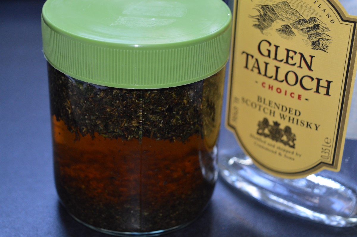 Doe de 20 gram verdampte wiet in een afsluitbare glazen pot zoals de lege en uiteraard schoon gewassen honingpot die wij kozen. Uiteraard kun je ook een weckpot of iets dergelijks gebruiken, zolang hij maar schoon is en afsluitbaar en groot genoeg. Voeg hier de Whiskey aan toe en sluit het potje af met de deksel. Vervolgens zet je het 72 uur weg in een donkere kast om te laten trekken. De cannabinoïden die nog in de verdampte wiet zitten, zullen in de 72 uur oplossen in de alcohol.