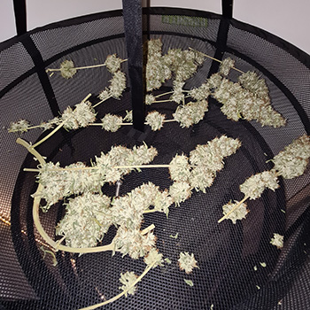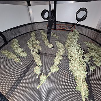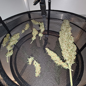 Even terug naar de voorgaande ronde dus, om de opbrengst uit het droognet te verwerken. Als eerste was de bovenste laag van het droognet aan beurt. Hier had ik de Critical Orange Punch te drogen gelegd. Na het verwijderen van de takken hield ik 89 gram gedroogde wiet over.