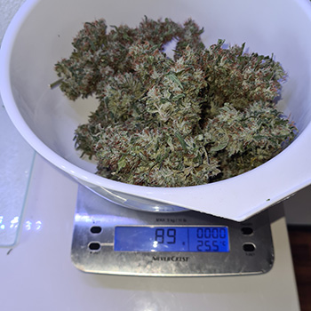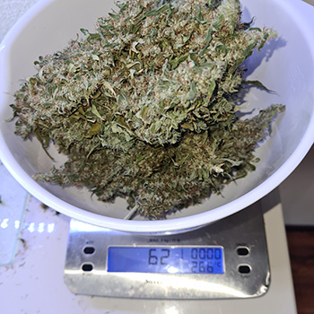 Als laatste stond de derde Frisian Duck op het menu om te knippen; deze had als bijnaam ‘de reus’. Na het verwijderen van de takken bleef er 62 gram wiet over. Deze leek iets compacter dan de andere Frisian Ducks, en rook ook iets sterker. Het totaal van deze kweekronde komt dus uit op 230 gram wiet. Dat is niet echt veel maar het komt waarschijnlijk omdat de Frisian Duck een typische buitenplant is.