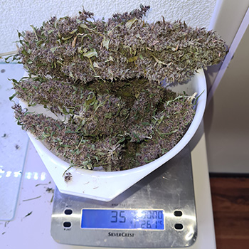 Op de tweede etage van het droognet lagen de toppen van de eerste Frisian Duck. Deze is mooi paars opgedroogd, en op het eerste gezicht zag het er goed uit …tot ik het van wat dichterbij bekeek. Het is een heel luchtige wiet geworden, die helaas zo licht als een veertje is. Na het verwijderen van de takken hield ik slechts 35 gram wiet over. Dat was best schrikken want 35 gram is niet veel. En de top zag er nog wel zo veelbelovend uit!