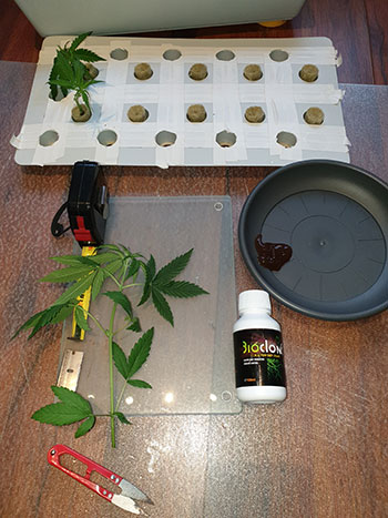 Bij het stekken gebruik ik een scherpe schaar en een nieuw scherp en schoon mesje. Wat je ook nodig hebt is stekpoeder (of in mijn geval gel genaamd Bioclone van BAC), een schone ondergrond om op te snijden en een rolmaatje.