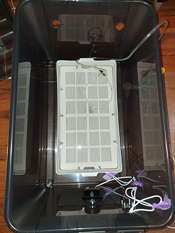 In mijn eerste kweekavontuur kwam deze pluggenbak al een keer voorbij. Ondertussen heb ik hem even onder handen genomen. Ik heb het geheel zonder deksel in een 40-liter Curver opbergbox geplaatst en er een webcam in gehangen. Onder het witte rooster zit een bruissteen uit een aquarium met een luchtpomp buiten de box. De stekkenbox is ook voorzien van led verlichting. Hiervoor maak ik gebruik van twee IKEA VÄXER Led-plantenverlichting. Deze zijn bevestigt aan de deksel van de opbergbox.
