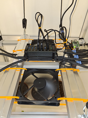 Ik heb twee 120 millimeter ventilatoren en de raspberry pi zero camera op de lamp gemonteerd. Dit is niet nodig en zal de lamp niet beter doen presteren maar nu staat het niet meer op de bodem en hangen er geen kabels meer in de weg bij het maken van foto’s. Ik heb de USB-hub er ook opgezet om de ventilatoren en camera van stroom te voorzien. De hub krijgt stroom van de accu’s van de zonnepanelen.