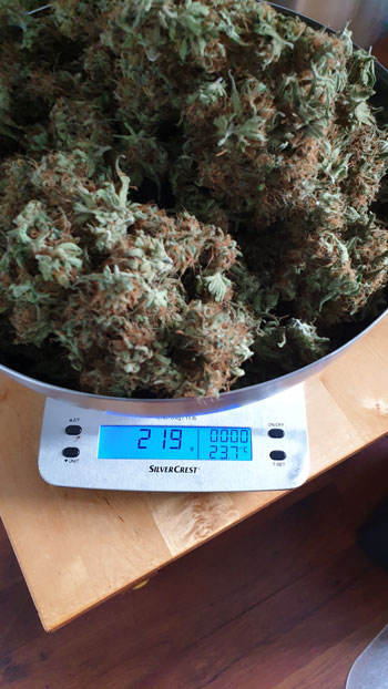 Het moment is aangebroken waar ik al een tijdje naar uitkijk… het wegen van de wiet! De wat mindere toppen uit de witte bak wegen samen 107 gram. De mooie toppen uit de rvs-schaal wegen 219 gram! Na het zien van de resultaten heb ik alles nog drie keer nagewogen omdat ik het niet echt geloofde. Zelfs de weegschaal heb ik nog even geijkt met kalibratie gewichten en het klopt echt.