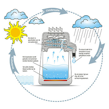 Wanneer je de alcohol terugwint door het te laten condenseren en op te vangen noem je dat destilleren. Misschien heb je in de scheikundeles weleens een destillatiekolom gezien. Dat is niets meer dan een glazen buis welke gekoeld wordt, zodat de te destilleren stof condenseert en van gasvorm naar vloeistof gaat om het te kunnen opvangen. Hieronder zie je zo’n destillatie kolom.