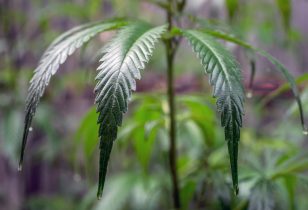 Een wietplant vlak na een flinke regenbui. De grond is wat te nat wat zich uit in omlaag krullende bladvingers.
