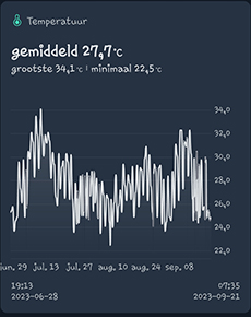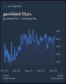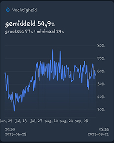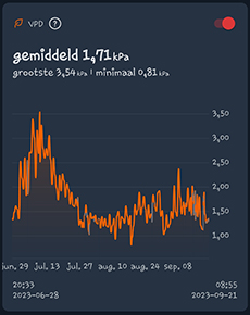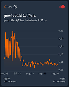 Dan zijn we aangekomen bij de gegevens van de kleine CNNBS G-Kit met de twee Sneeze dames. Hier ben ik aan het experimenteren geweest met twee sensors. Eén op een ventilator op de armatuur en één onder de afzuiger. Aan het eind van het verhaal waren de waardes te verwaarlozen en er was bijna geen verschil. Hier ga ik terug naar één sensor onder de afzuiger. Dan terug naar de cijfers. De gemiddelde temperatuur van deze kweekronde was hier 27,7 graden Celsius. De gemiddelde luchtvochtigheid was 54,9 procent en de VPD was gemiddeld 1,71 kPa.