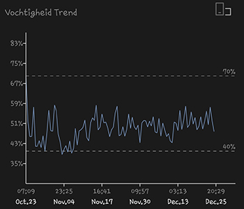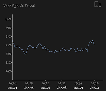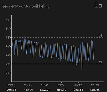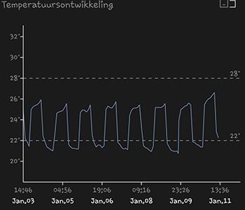 Een overzicht van het klimaat van deze kweekronde. Helaas is deze in twee grafieken gesplitst door een lege batterij maar het geeft alsnog een duidelijk beeld van het verloop van het klimaat van deze kweekronde. Het was lekker warm met iets koelere temperaturen aan het einde van de kweekronde. De luchtvochtigheid was redelijk binnen de marges met een droog einde.