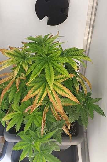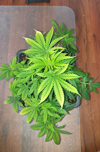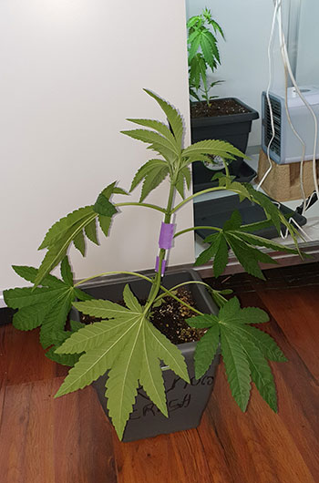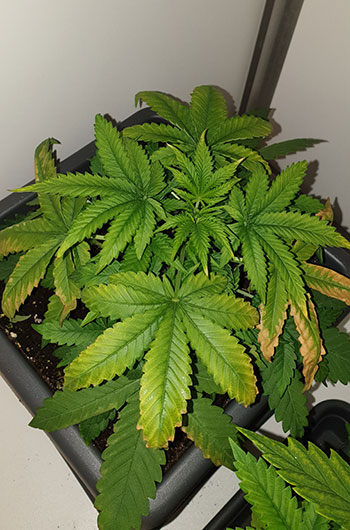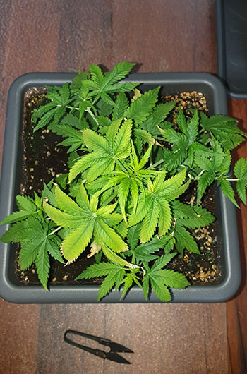 Hierboven zie je foto’s van de eerste week (Week #2) na de verhuizing uit de CNNBS G-Kit XL naar de CNNBS G-Kit met verhogingsset. De twee dames hadden duidelijk moeite met de overgang van de 315 Watt CMH naar de 100 Watt Hans Panel. Er ontstaat vergeling aan de grote schutbladeren.