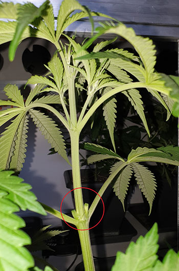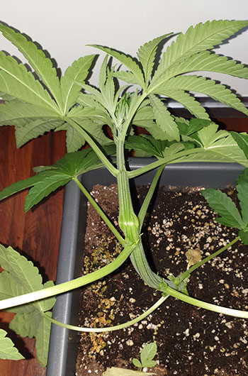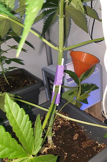 Ik heb twee grote wattenstaven gepakt, en alleen de steel gebruikt om de breuk/knik met afplaktape rechtop te houden. Nu, een paar dagen verder lijkt de plant goed te herstellen. Het is een sterk plantje van Amsterdam Genetics.