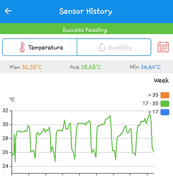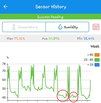 En dan het weerbericht. In de CNNBS G-Kit XL is het volop zomer momenteel. De gemiddelde temperatuur is met 28,68 graden Celsius licht gestegen t.o.v. vorige week. De gemiddelde luchtvochtigheid van 50.87% is ook en wederom licht gestegen. Ik ben twee dagen vergeten de Arctic Air op tijd bij te vullen. Dat is ook duidelijk te zien in de grafiek van de luchtvochtigheid (zie omcirkelde dalingen).