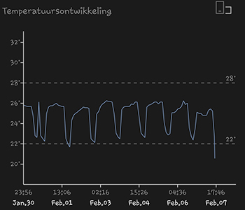 De Mohammeds krijgen 500 milliliter water met voeding van Plagron. Ik houd hier momenteel de tweede week van het voedingsschema aan en ga daar nog één extra week mee door. De gemiddelde temperatuur was deze week 24,04 graden Celsius. De extreme daling die je in de grafiek ziet, was toen ik aan het werk was in de kamer en de deur open had laten staan waardoor de temperatuur erg snel daalde. De gemiddelde luchtvochtigheid was afgelopen week 48,57 procent.