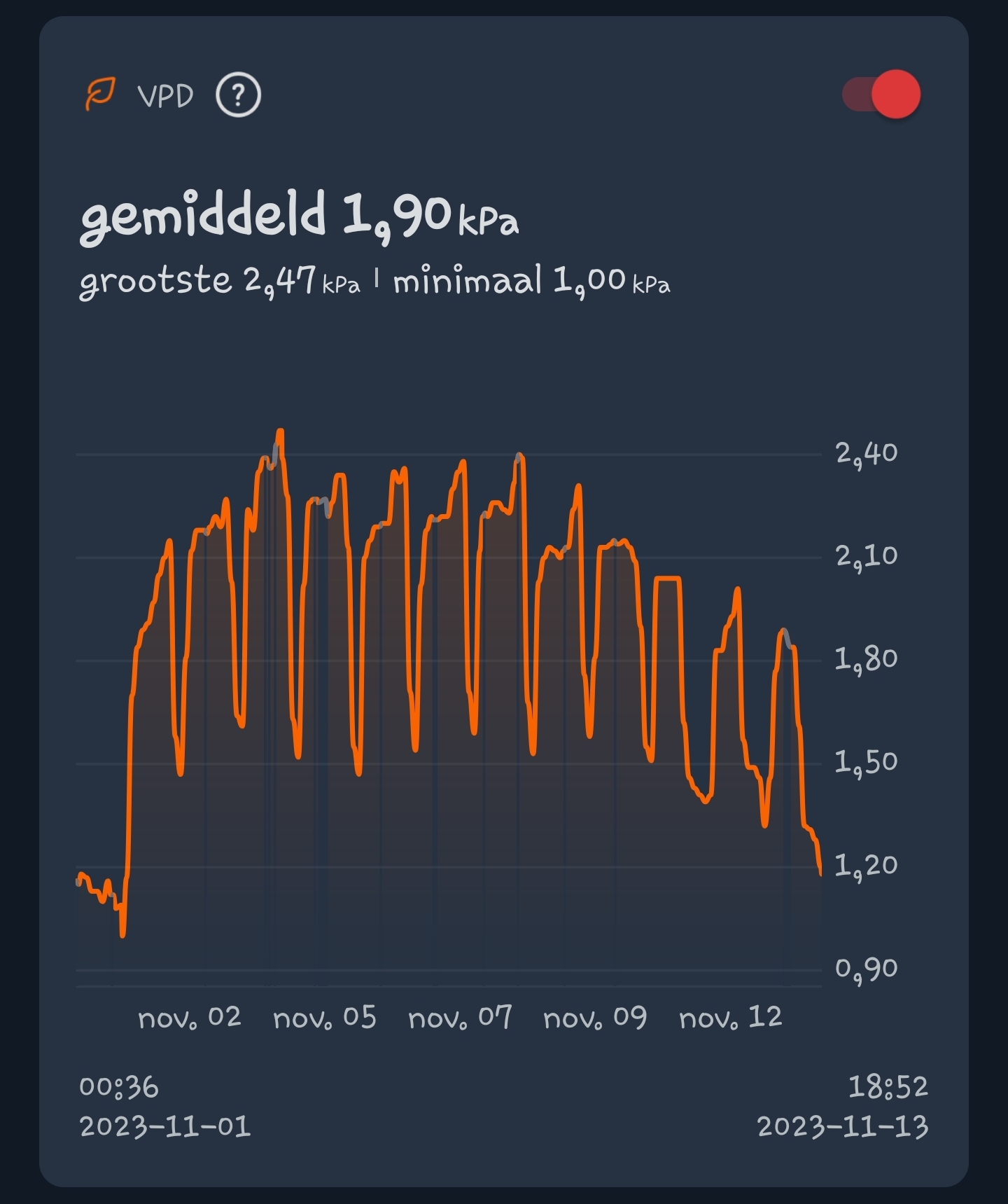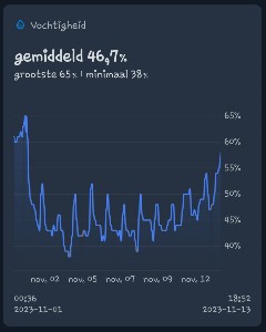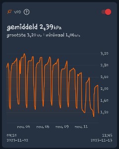 Het verschil in gemiddelde temperatuur is op het moment het grootste verschil tussen de twee plekken. Het verschil in luchtvochtigheid is niet extreem maar de pieken en dalen zijn wel veel groter dan boven in de kast. Of dat straks ook nog zo is als de planten groter worden is nog even afwachten. Het verlichtingsschema heb ik afgelopen zaterdag ook aangepast van 18/6 naar 12/12. Twaalf uur aan en twaalf uur uit dus, en beter bekend als het bloei-lichtschema.