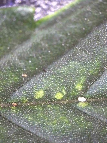 Het witte vlekje lijkt iets weg te hebben van een cocon van een of ander insect. Bij de inspectie van de rest van het blad heb ik geen gaatjes of andere beesten kunnen vinden, we houden het in de gaten. Blijkbaar was er wel een vezel van mijn sweater aan het blad blijven zitten. De andere Sneeze planten hadden ook allebei één raar blad.