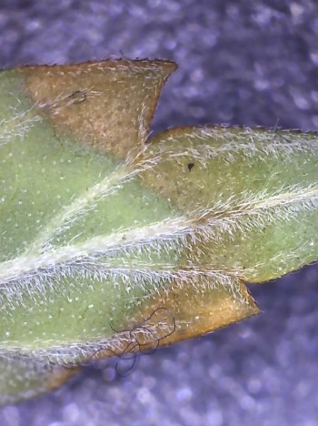 “Vreemd? Laat ik het blad er maar afknippen…” Ik trek de lade van het bureau open om daar ergens onder in mijn bril op te snorren. “Ja ja, ik zie het nog niet goed maar er zit wel iets.” Tijd om de microscoop er bij te pakken.