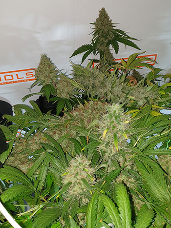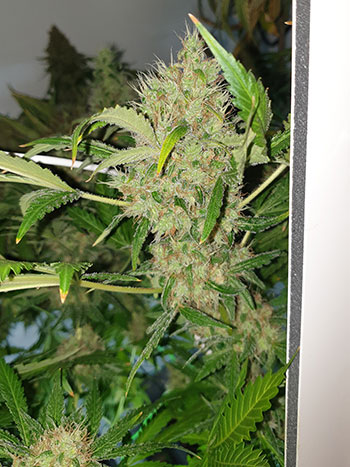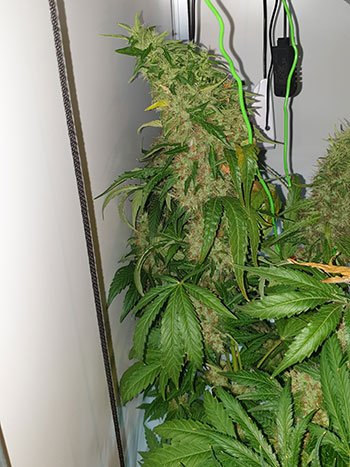 De Critical Orange Punch heeft de hitte ook weer goed doorstaan. En wat schittert ze mooi in het licht van de flitser! Haar grootste top heeft op het dikste punt een diameter van 55,51 millimeter. De White Choco Haze heeft zich helemaal niets van de warmte aangetrokken. Sterker nog, ik denk dat ze wel van de hitte genoten heeft. Dat is ook duidelijk terug te zien in de diameter van haar toppen: 58,53 millimeter. De AK Choco Kush had het loodje vorige week al gelegd, weet je nog?