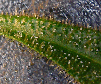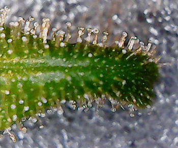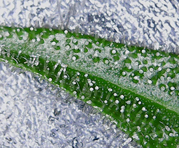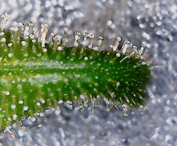 Bij de Morning Glory heb ik een suikerblaadje van een top genomen die een beetje aan de onderkant van de plant groeide. Zelfs dit suikerblaadje bevatte veel witte trichomen dus de Morning Glory’s moeten er ook aan geloven.