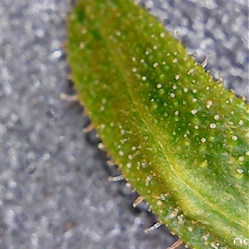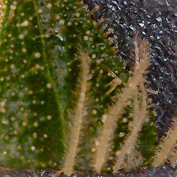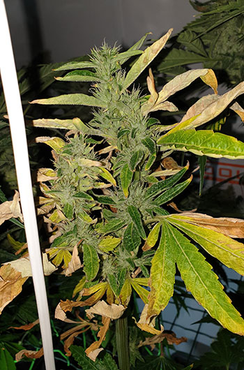 De AK Choco Kush heeft bijna geen trichomen op de bovenzijde van het blad. Aan de onderzijde zit het echter helemaal vol. Dit komt doordat het blad is opgekruld ter bescherming tegen de hitte. Hierdoor heeft de plant er meer op de onderzijde gemaakt. Hier schijnt immers nu het licht op. De White Choco Haze heeft ook hier en daar al wat witte trichomen. Deze wietplant is duidelijk een inhaalslag aan het maken.