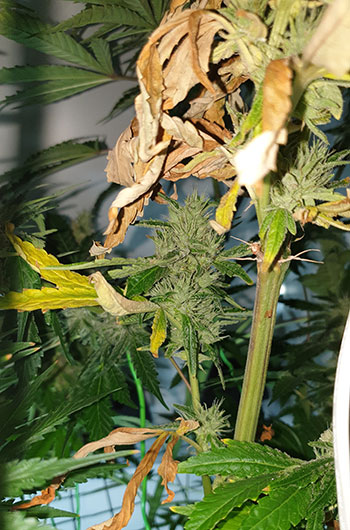 Het klimaat in de CNNBS G-Kit XL is met opzet niet meer zo vriendelijk voor de planten. Om stress uit te oefenen op de planten laat ik het steeds droger worden in de kweekkast. Nu we richting het einde van de kweekronde gaan, zullen de planten hierdoor extra hars (trichomen) aanmaken. De trichomen beschermen de planten namelijk voor uitdroging; door de luchtvochtigheid laag te houden stimuleer ik de productie.