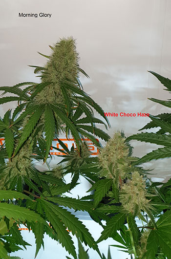 De White Choco Haze is een heel ander verhaal. Deze dame staat mooi in bloei en drinkt lekker door. Ik heb haar deze week in de time lapse spotlight gezet. Zo is de ontwikkeling van de toppen goed te volgen. En dan de drie Morning Glory’s, misschien wel de trots van deze kweek. Met deze dames gaat het super! Hun bloemtrossen zijn al zo zwaar dat de takken aan het doorzakken zijn. Die zal ik in de loop van de week wel moeten opbinden.