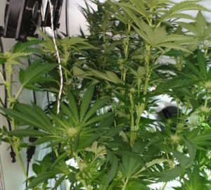 Nu het groene bos wat teruggedrongen is, zie je als je heel goed kijkt de witte topjes. Boven de lamp heb ik nu nog een goede 11 centimeter over voor ik tegen het luchtfilter aanzit. Dit zal voldoende zijn voor de volgende 6 weken. Als de toppen straks groter worden en zwaarder zakt het allemaal wat in.