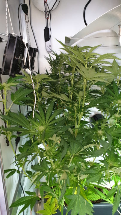 De ventilatoren aan de linkerkant stonden vol op de kleine topjes van de Morning Glory’s. Deze heb ik naar onder in de kast laten zakken zodat ze niet meer tegen de toppen aanblazen.