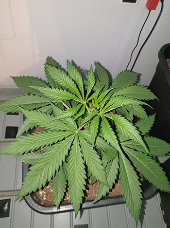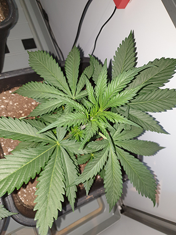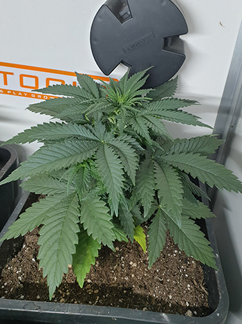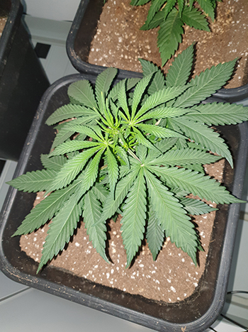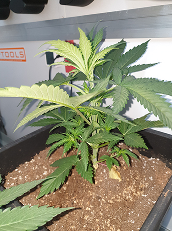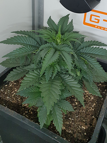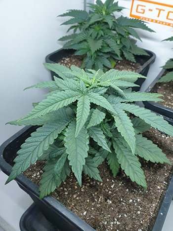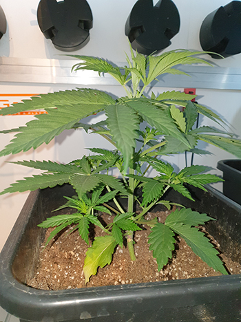 Aan de linkerzijde van de CNNBS G-Kit XL vinden wij de Big Yeti met de meeste ruimte om te groeien. Deze heeft een halve kweekkast voor zichzelf, lekker luxe. Ze ziet er ook goed uit en heeft een mooie dikke stam en is al flink aan het uitlopen. Deze Big Yeti heeft nu een hoogte van 30 centimeter; ze lijkt wat aan de kleine kant maar ligt wat dieper in haar bloempot in vergelijking tot de andere planten.