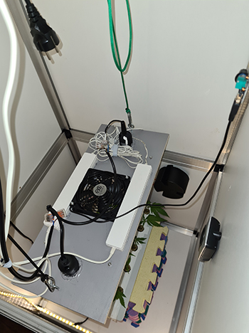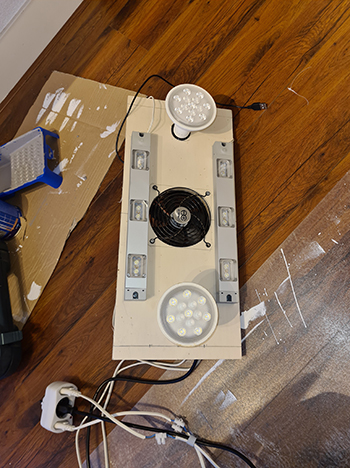 Ik heb de twee LED balken versterking gegeven van twee 14 Watt LED kweeklampjes met een gewone E27 fitting, eveneens van de IKEA. En toen ik toch bezig was heb ik ook meteen een ventilator in het armatuur verwerkt. Zo hebben de plantjes een lekker briesje tijdens het groeien en zit alles in één verwerkt.