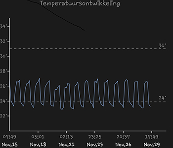 En dan ben ik nu aangekomen bij de cijfers. Oftewel de kweekfeiten op een rijtje. De 315 Watt CMH kweeklamp om daar maar eens mee te beginnen, hangt op een hoogte van 25 centimeter boven de grootste dame. De gemiddelde temperatuur was afgelopen week 24,36 graden Celsius een lekker herfst temperatuurtje. De gemiddelde luchtvochtigheid van afgelopen week was 55,27 procent. Het klimaat is redelijk stabiel de afgelopen weken.