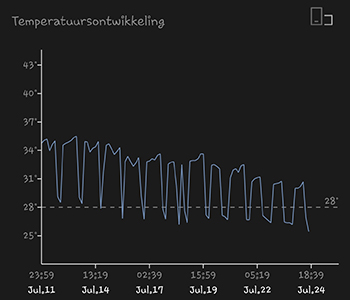 Dan zijn we aangekomen bij de VPD grafieken. Zoals ik al vertelde staan de kasten in één kamer. De grafieken volgen nog steeds dezelfde route, alleen met iets andere waarden. De waarde is wel nog steeds aan de hoge kant. Nou, zeg maar rustig dubbel zo hoog als ik ze zou willen hebben; zo rond de 0,7 tot 1 kilopascal.