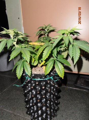 De planten gaan nu overdag naar buiten in de tunnelserre welke de storm van het voorbije paasweekend gelukkig heelhuids doorstaan heeft. In de serre is het een vijftal graden warmer dan buiten, nog geen optimaal klimaat maar toch zijn de planten gegroeid. Enkele dagen na het vorige verslag zijn de Himalaya Mountain en de 3 Phatt Fruity’s verpot naar hun definitieve bestemming. De Himalaya Mountain zit nu in een 20-literpot, de Fruity’s elk in hun 15-literpot. Dit omdat ik van die laatste soort minder verwacht. Hoewel ze er niet slecht uitzien zijn ze gewoon nooit snel gegroeid. Behalve af en toe de bovenste groeischeut er half uit knijpen (toppen), heb ik er om die reden geen speciale technieken op los gelaten. Door de kleinere potten zullen ze in de bloei ook niet al te hoog worden verwacht ik.