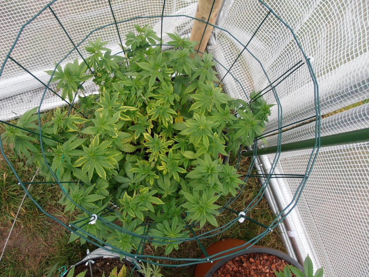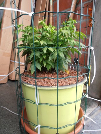 De Himalaya Mountain heeft rond zijn pot een handige kooi gekregen. Deze is gemaakt van een stuk omheiningsgaas. Het is nu het derde jaar dat ik deze ‘fuiken’ gebruik, hoofddoel was om gemakkelijk takken naar beneden te trekken en vast te binden. De kooi bewijst echter goed zijn nut als extra steun, tijdens felle wind, en voor de bloemtoppen. Ik raad wel aan om draad te gebruiken met brede mazen, zodat je handen er nog door kunnen bij het verzorgen van de plant. De draad is met snelbinders bevestigd aan de bovenste rand van de pot, en onderaan aan de rand van de onderzetter. De diameter van de pot en onderschotel zijn ongeveer even groot, dit maakt dat alles één stevig, rond geheel vormt.