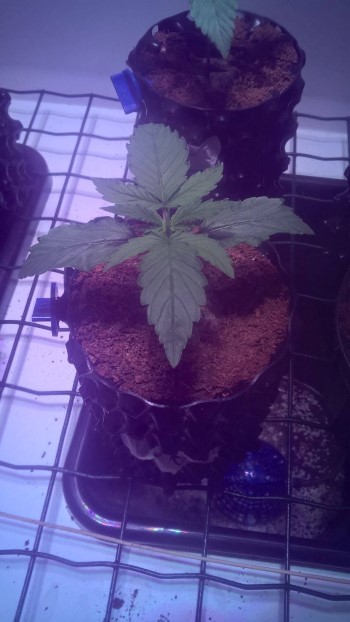 Hij kweekt met LED. Niet met zomaar een LED maar een Budmaster II G.O.D. 6. Dit is een top of the line kweeklamp. De dames vinden het er geweldig, ze zijn weliswaar pas een centimeter of 3 gegroeid maar hebben wel al 3 internodes. De foto’s lijken een beetje blauw maar dit is omdat we een groene lens voor de camera moesten houden, anders lukte het niet om fatsoenlijke foto’s te maken onder die lamp. Verder krijgen ze in het kuuroord nog wat extra Canna Rhizotonic om de wortelgroei te stimuleren. Ze zullen tot de volgende update bij hem blijven logeren, hierna gaan ze dan naar hun 45 Liter airpots die ik vorig jaar ook al eens heb gebruikt. Tot over twee weken!