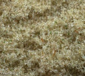 In de derde stap ga je de trichomen van hun stammetjes scheiden met behulp van de 70 micron zeef. Hoe langer je met deze stap bezig bent, hoe mooier je eindresultaat. De stammetjes van de trichomen zullen door het gaas vallen en je eindproduct blijft op het 70 micron gaas liggen. Als je tenminste voorzichtig te werk gaat met je bankpasje. Blijf je kief heel voorzichtig heen en weer halen over de zeef. Je kunt ook voorzichtig op het doek trommelen. Na een minuut of tien lijkt het al een stuk schoner, maar de echte 95% pure trichomen krijg je pas na ongeveer een half uur doorzeven. Het resultaat ziet er dan, als je alles goed hebt gedaan, ongeveer zo uit.
