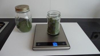 Ik maak de pasta met kokosolie en 30 gram gedroogde CBD Kush toppen. De toppen zijn door de vroege intrede van de herfst niet heel groot, maar omdat de plant dat wel was heb ik meer dan genoeg voor mijn zelfmedicatie. Ik begin met het malen van de wiet in mijn keukenmachine tot het een poeder is geworden. Vervolgens verwarm ik de kokosolie au bain marie tot het helemaal gesmolten is en vloeibaar is geworden.