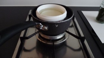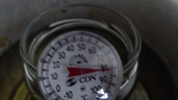 Nu stop ik de gemalen wiet in een glazen pot en doe hierbij zo’n 120 milliliter van de vloeibare kokosolie. Dat mengsel moet je vervolgens 10 en een half uur verwarmen op 80 graden Celsius. Ik doe dat door de pot in een klein frituurpannetje met olie te zetten. Olie kun je namelijk heel gelijkmatig warm laten worden, met een vleesthermometer controleer ik af en toe de temperatuur.