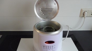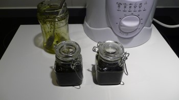 Om 9.30 ’s ochtends heb ik het wietpoeder/kokosoliemengsel in het frituurpannetje gezet en ’s avonds om 8 uur was het klaar. Het is inderdaad een dikke pasta/puree geworden en ik doe het in twee kleine glazen weckpotten die je bij de Blokker per vier stuks kunt kopen. De wietpasta moet wel supergezond zijn want het smaakt absoluut niet lekker, al denkt mijn zoon daar anders over. Ikzelf vind alleen de lucht ervan al vies ruiken en dacht, daar moet ik iets op bedenken want zo krijg ik de pasta echt niet naar binnen.