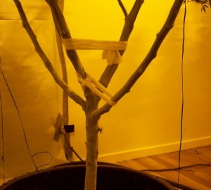 Als de plant is hersteld van het toppen of het fimmen kun je gaan beginnen met het platleggen van de takken. Je spreid de takken uit elkaar en laat ze weg groeien van de hoofdstam. Je kan zowat alles gebruiken om de takken mee vast te binden. Gecoate elektriciteitskabels zijn handig, want die kun je vrij makkelijk buigen, zonder dat je knopen hoeft te leggen. Als je een haak aan een eind van de draad buigt, kun je het andere eind bijvoorbeeld aan de pot vastmaken. Als je de bovenrand van de potten van wat gaatjes voorziet, kun je er nog gemakkelijker aan vast haken.