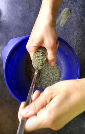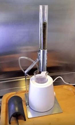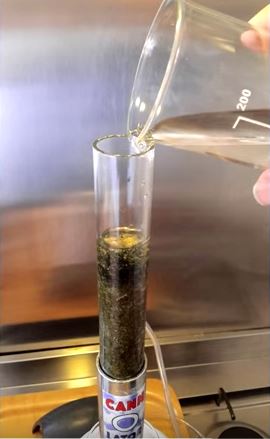 Stop de fijngemaakte wiet nu in een van de extractiebuizen, aan de onderkant ervan zit een kleine opening die wel alcohol, maar geen wiet doorlaat. Om de 20 gram wiet er allemaal in te krijgen kun je het een aandrukken met de achterkant van de meegeleverde krabber. Plaats de gevulde extractiebuis nu in de Cannolator en plaats de glazen maatbeker eronder om de alcohol in op te vangen.
