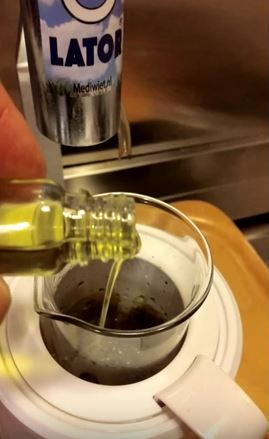 Giet nu de alcohol aan de bovenkant in de extractiebuis op de wiet. Gebruik zes keer het gewicht van de cannabis aan milliliters alcohol. Op 20 gram wiet gebruik je dus 120 milliliter alcohol. De hars met daarin de THC en andere cannabinoïden lost op in de alcohol. Wacht tot alle alcohol goed en wel uit de extractiebuis is gedruppeld en plaats de maatbeker nu in de babyfles verwarmer.