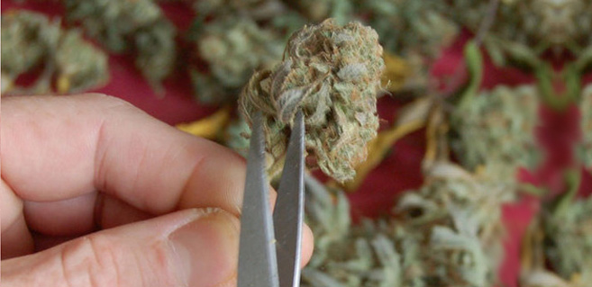 Voorkom bij het knippen zoveel mogelijk dat je met je vingers de toppen aanraakt, daardoor gaat de potentie van je wiet namelijk achteruit. Knip per tak en houd de tak dus bij de stam vast. Begin met het wegknippen van de schutbladeren waar niet of nauwelijks trichomen (harskristallen) op zitten. Een kleine scherpe schaar is daarbij het gemakkelijkst.